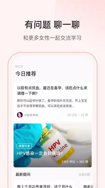 除了基本的经期记录,“美期”还有不少实用的功能。比如可以学习健康知识,浏览社区里的问题讨论,还可以管理体重和记录每天的状态。这些小细节都考虑得很周到,特别是那些状态标签选项,像“备孕中”或者“避孕”,真的挺贴心的。