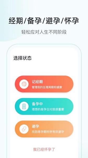 5、设置了多种状态标签选项,选择状态的页面提供了记经期、备孕中以及避孕和已经怀孕的状态;