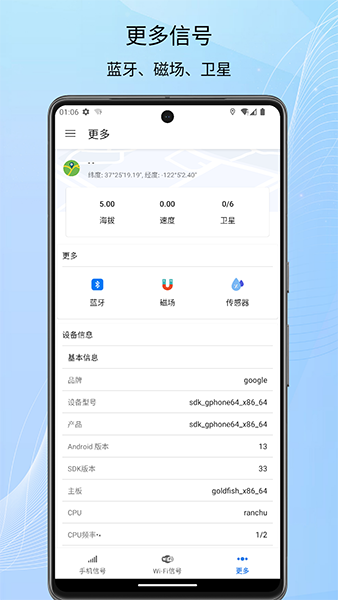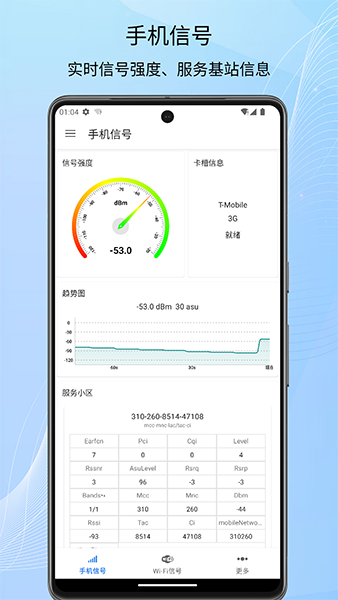 我觉得这个工具挺实用的,特别是对于那些经常需要测试网络信号或者优化WiFi环境的人来说。它不仅可以检测手机信号、WIFI信号、GPS信号和蓝牙信号,还能查看传感器信息,比如温度、指南针等数据。软件采用最新的算法和技术,检测结果更稳定、准确。界面清晰美观,还能实时显示信号变化图,帮助用户更好地了解网络状况。