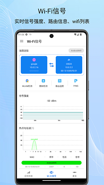 2.WIFI信号:实时检测WIFI信号强度,查询WIFI信息,如信号强度、mac地址、信道、IP配置、连接速率等相关信息,并获取wifi信号与信道等信息,wifi安全性检测,wifi下连接设备信息;
