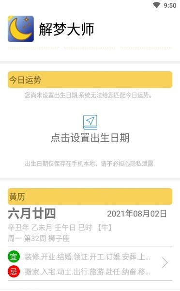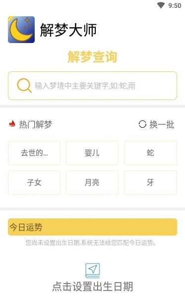 解梦大师app是一款专门用来解梦的软件,当大家做了奇怪的梦时都会非常好奇为什么会做这个梦,这时候大家就可以使用这款软件,它支持根据梦境来推算大家在现实生活中的命运,详细的解析让大家可以了解到梦境的含义。此外软件内还支持称骨算命、查看黄历、八字合婚、姓名测试、数字命理等服务,并且所有的功能都是免费的,喜欢的不要错过了哦。