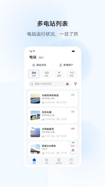 1)多电站列表,同时管理多个电站,掌握电站整体运行状况。迅速筛选出故障或断连电站,及时定位修复。