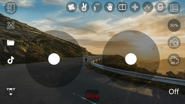 同时使用APP的虚拟摇杆可以控制无人机飞行,并且能在APP上拍照和录像。