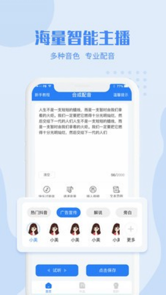 甜美萝莉音,霸气御姐音,搞笑大叔音,活力童音,正宗播音腔等音色都能在这里找到。