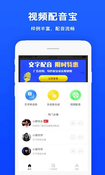 这款视频配音app功能强大又好玩,里面有很多现成的配音素材,可以用来给短视频配声音,还能用在广告、地摊叫卖、美食店宣传啥的。最棒的是,它能让你改变自己的音色和音调,甚至还有30多位智能语音机器人,男声、女声、童声都能选。你可以把文字直接转成语音,或者把几段语音合在一起用。