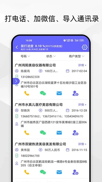 电销客源软件内直接拨打联系商户,拨打进度统计标识,可导出Excel,可直接导入手机通讯录。