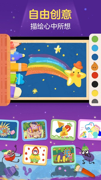 2、“创意动画”有不同主题的美术创作活动,让孩子的绘画动起来;“自由涂鸦”有风格多样的涂色游戏,用色彩点亮孩子的创造力!自由画板的工具丰富多样,让孩子轻松入门、方便上手。