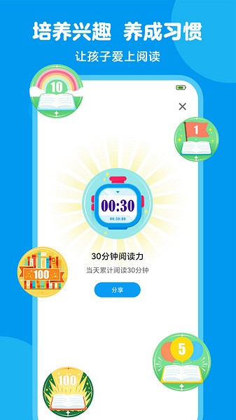 4、多维度阅读激励:精美阅读勋章,激发孩子阅读兴趣,养成阅读习惯,提升阅读成就感。