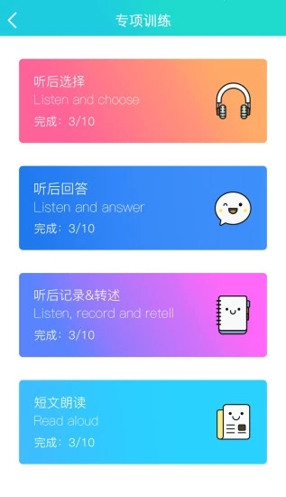 3.它是优质的英语学习教育软件。软件是英语听说学习教育,软件为用户提供了让学生们轻松的提升成绩,给与用户真实的模拟考场,仿真似的训练专业的练习,满足学生们的备考和练习要求。