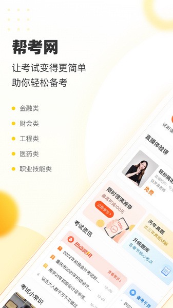 帮考网app官方版是一款专业的考试学习软件,软件主要是帮助各行各业考证的用户们轻松通过考试。软件内涵盖了金融、财会、法律,还是工程、医药等各种相关职业资格证考试的知识题库,用户们可以在帮考网报名各种学习课程,同时软件还为大家提供了模拟考试、错题回顾、考前押题、章节练习等特色和有针对性的服务,帮助大家及时了解和弥补自己的不足之处,让大家可以轻轻松松就通过考试,有需要的快来下载吧!