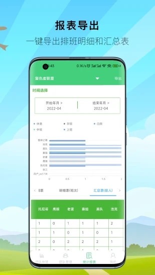 数据报表导出:一键导出排班明细表和汇总表,方便记录考勤信息;