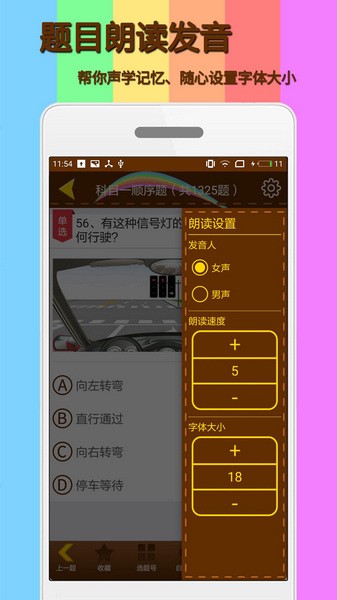 【语音朗读】具有语音朗读功能帮您声学记忆,带上耳机,在地铁、公交随时随地轻松学习,语音朗读功能是你考驾照学车的好助手,可以设置朗读速度,朗读语调,朗读音量大小和朗读人物(包括男声和女声)。