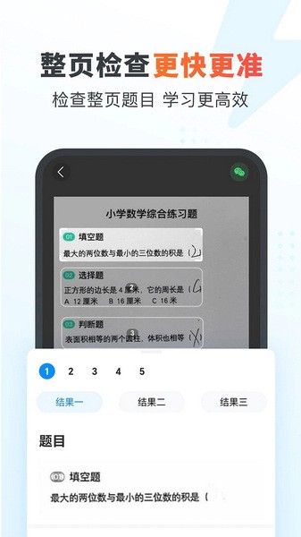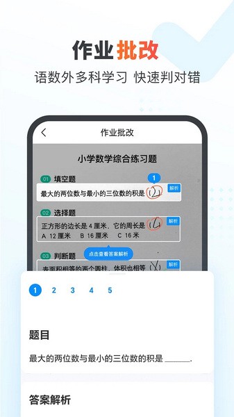1、批改数学作业:集【批改数学作业】+【拍照搜题】于一体,支持学龄前的宝宝至小学6年级口算、竖式、脱式、混合运算、解方程式等多题型作业批改。简单一拍,批改搜题全搞定。