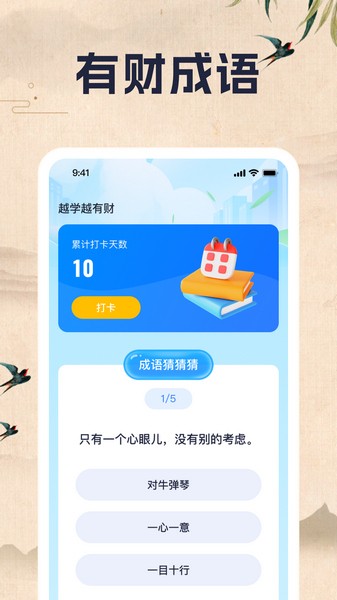 3、可参与每天的学习打卡,将你学习成语的坚持天数打卡记录下来;
