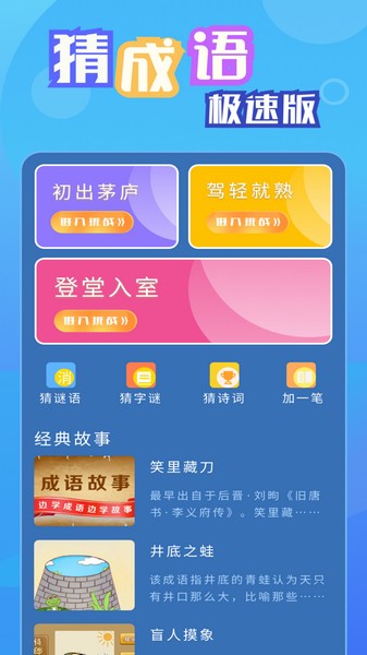 设置不同的成语闯关拓展,通过猜成语就可以一键闯关。