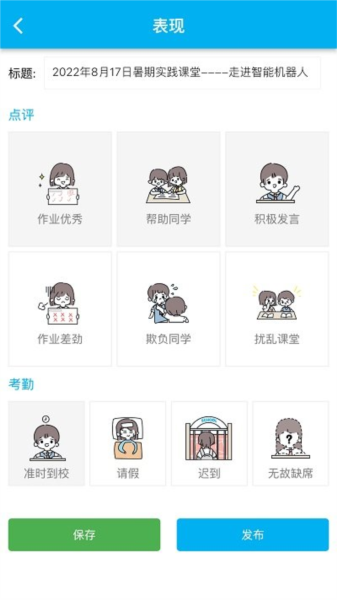 在表现页面中可以通过发布各类信息记录学生的点评以及考勤信息