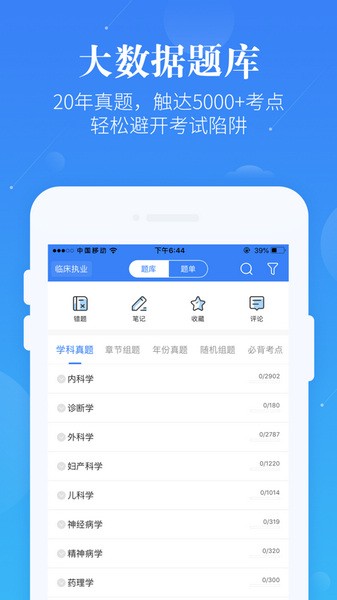 执业医师蓝基因APP是一款主打执业医师及执业助理医生的考试学习软件,收录了1991~2023年的各项真题,多达5000+考点,为用户们提供了名师在线视频课程、名师在线直播、多样随机组题、重点题目收藏,错题同步记录等多项功能,软件内还采用了智能大数据采集分析技术,能根据不同用户当前学习情况,智能提供基础、真题、冲刺等不同阶段学习课程,最大限度帮助考生避开考试陷阱,用户还能通过智能乱序功能打乱考题,避免因为记忆效应出现的成绩虚高,让你真正掌握知识点,搭配录播、直播课程,支持缓存下载离线收看,随时随地都能开始学习,同时用户还能在论坛中浏览备考方法,与自己实际情况相结合,更高效的进行学习,让用户们可以在最短的时间内拿到证。