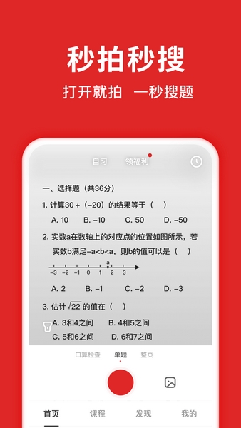 【拍照搜题】轻轻一拍,解答立刻呈现,更有知识点解析、帮你迅速理清思路,轻松学会