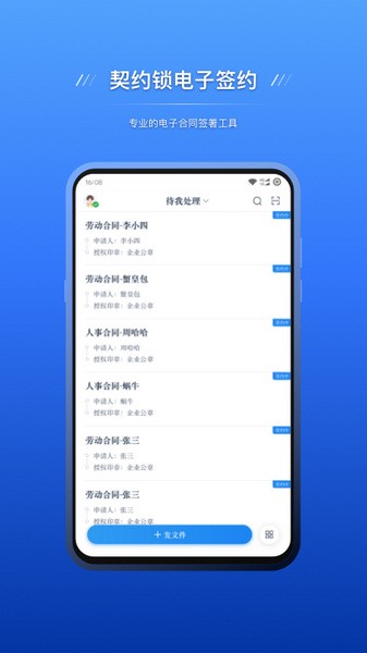 契约锁电子签约app是一款专业又好用的电子合同签署工具,不仅能够一键发起电子合同的签约流程,还可以更安全的管理电子签章、电子印章等等,为用户们提供一站式的电子签约服务。此外,专业的电子身份保护功能可以在最大程度上保障用户们的身份信息安全。软件界面简洁清爽,大大简化了原本纸质合同的签约过程,也提高了办公的效率。