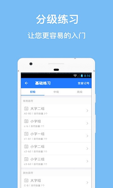 考虑很多刚接触五线谱的用户遇到这么多钢琴键而不知所措的情况,我们针对性的将基础练习分为初级、中级、高级。在初级中我们将每个组别单独拎出来做练习,这样能让用户更好的练习和固。