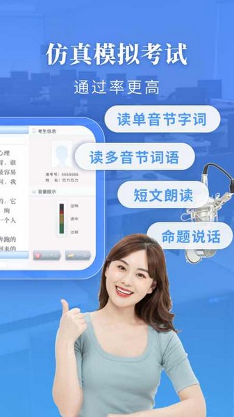 全真试题,AI智能语音技术模拟正式普通话考试,帮你提前预估自身的普通话水平,为实地参加普通话水平测试打好基础。