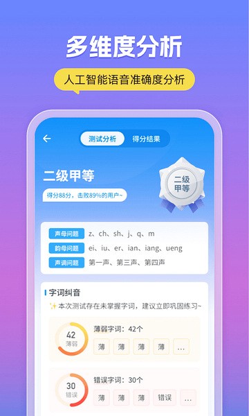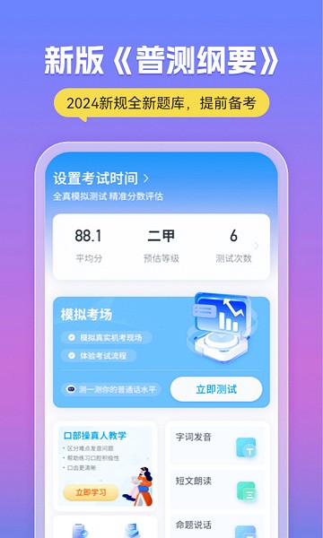 总的来说,这款APP不仅功能强大,界面也很简洁友好,用起来完全不会觉得枯燥。它让我对普通话考试充满了信心,感觉只要坚持使用,通过考试绝对没问题!