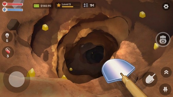 玩家扮演挖掘者,在自家后院或其他场景中,使用铲子等工具从地面开始向下挖掘。地下世界是随机生成的,会有各种地形和不同种类的宝藏,如金色矿石、古董、神秘遗物、破旧玩具等,越往下挖掘,遇到的宝藏可能越珍贵。