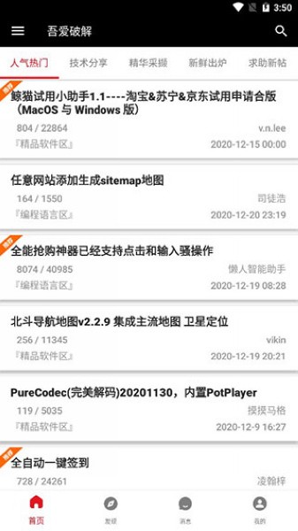原创发布区、脱壳破解区、软件调区、移动安全区等
