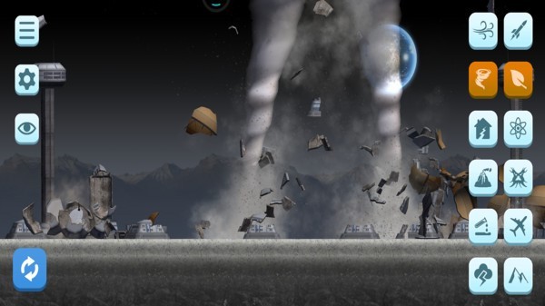 4、而中间多个功能按键则是破坏城市的各种方式,如下面类似雷达的图标,点击这个按钮,再点击城市,就会有一个陨石坠落到这座城市,将城市所有的建筑都摧毁掉。