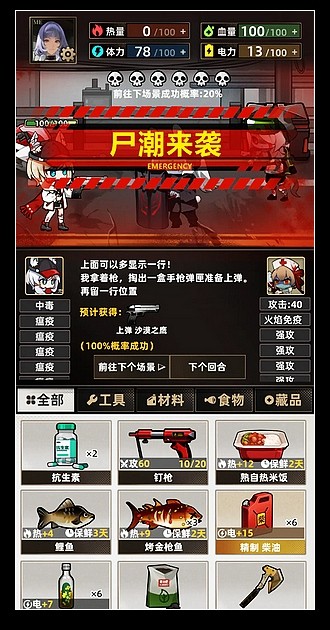 活鱼可以消耗5电量加工成烤鱼,方便面和自热米饭以及黄豆荚也可以耗费5电量加热,弹匣和麻醉剂可以合成麻醉弹匣(命中后减僵尸移速),弹匣和酒精棉球可以合成燃烧dan匣(命中后给僵尸提供20%易伤)两个不满的弹匣可以合成为一个(子弹最多为满),废弃金属和火药可以合成手枪弹匣,废弃金属和高级火药可以合成步枪弹匣。