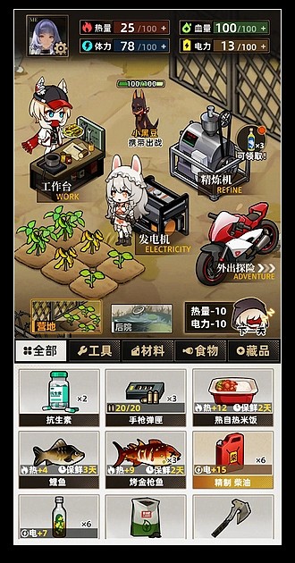 油菜荚黄豆荚大鱼菜籽油豆油汽油柴油,精炼机不能停哪怕半天,最差也得找桶汽油或者柴油精炼,保证每天靠精炼机额外产出10电以上,食物不缺可以炼中鱼,加油按精炼反顺序加,最优先衣服电池木头粪便。
