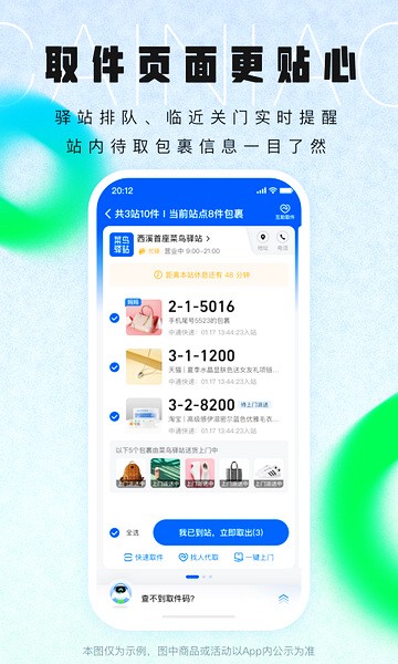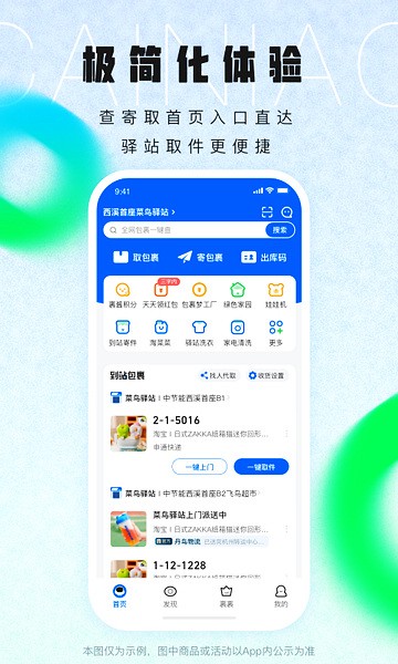 4、菜鸟驿站:网购包裹免费代收,包裹全程跟踪、到站点自动提醒,取货操作简便;同时驿站还提供便捷的寄件服务。