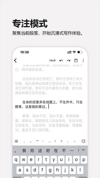 专注模式可聚焦当前段落,开启沉浸式写作体验;