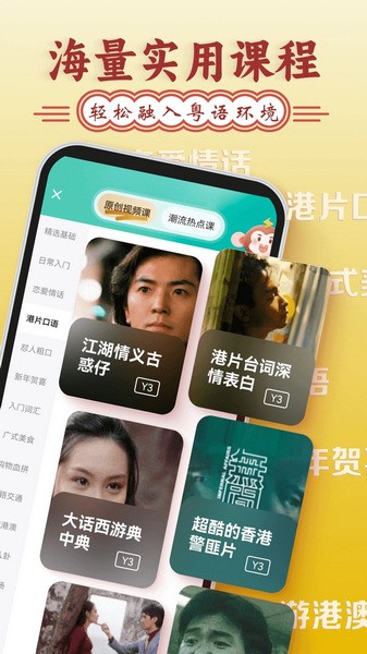 App里有好多有趣的学习方式:比如学唱粤语歌、看港剧台词、旅游用语等等。特别是那些经典的老歌,像陈奕迅、张学友的,听着音乐学语言真的超有趣!还有每天一句日常用语和各种分类对话教学,学习内容超级丰富。