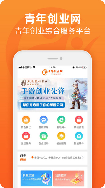 1、为用户提供各种创业服务,通过各种各样的服务内容帮助用户更轻松的创业;