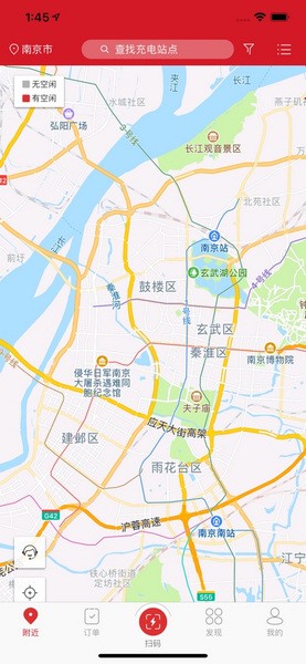 2、进入应用附近页面,实时定位查看附近充电桩的信息,选择有空闲的充电桩