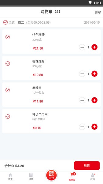 3、购物车界面可以看到加购菜品的详情
