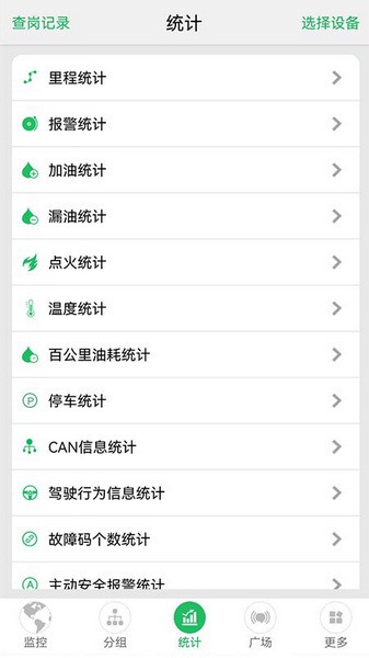 统计报表由里程报表、报警统计、加油统计、漏油统计、百公里油耗统计报表组成(注:可查询多辆车报表数据)