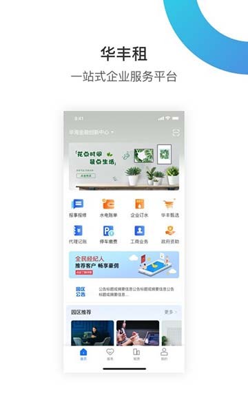 华丰租是一款专供华丰旗下园区服务的手机应用,主要为园区内的企业和个人提供一体化物业管理和增值服务。整合了线上线下资源,为企业和员工提供了便捷的租赁服务,涵盖办公楼出租信息查询、在线看房、委托找房以及推荐客户赚取佣金等功能。还支持用户进行日常生活的便利操作,比如水电费用在线支付、报修申请、停车缴费等,并致力于打造一个集企业合作交流、资源共享于一体的社区平台。