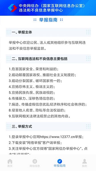 12377网络举报平台手机版是一款非常好用的网络举报平台软件,它是由中央网信办和不良信息举报中心一起打造的移动端举报软件,具有便利、高效、安全的特性,用户们下载该软件后不管遇到什么样的互联网违法和不良信息都可以在里面进行举报,官方接到举报后就会在第一时间响应,帮助大家解决遇到的问题,为众多的网民建立一个绿色安全的互联网网络环境。