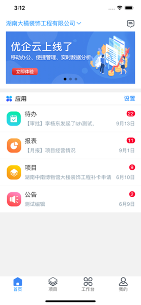 优企云是一款提供工程管理办公的应用平台,集成多种功能设置,支持日常办公、立项管理、合同管理、计划管理等服务、代办事项任务清晰分明,数据报表的统计和分析,最新公告消息的及时推送,流程十分清晰,项目进度实时跟踪。尽在掌握,协同办公,随时通讯交流!帮助千万企业降低协同与管理的成本,提升办公的效率,更为老板提供工程的的各项实时数据,让数据随处可见!
