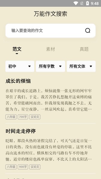 万能作文大全app是一款非常好用的作文辅导类软件,学生们经常写作文的时候可能会遇到没有素材可写的问题,这时候就可以使用这款软件,在这里提供了小学到高中的各种丰富的作文素材,其中主要包含了优秀文章、素材、真题和查询四个部分,大家可以直接搜索自己需要的作文题型,同时还能看到各个省份的每年模拟真题,积累更多的素材之后自己就能更加轻松的创作。