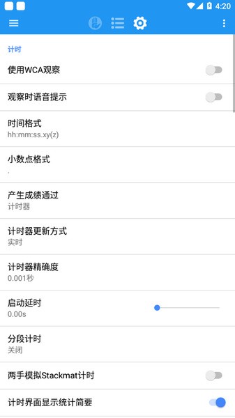第一个设置是“使用WCA观察”,这个默认是不打开的,如果打开则会先有15秒的观察时间,以此决定成绩,更加模拟WCA比赛,如果不打开就会直接开始计时