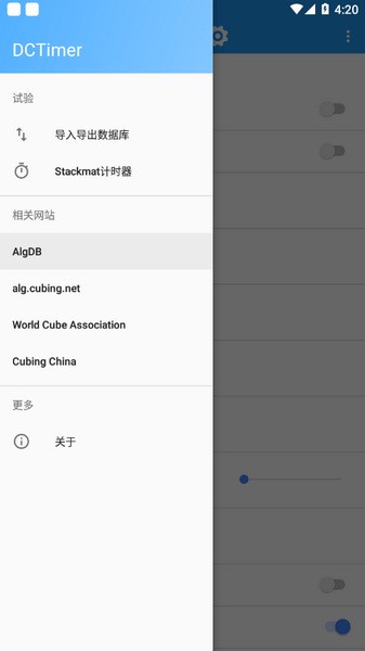 你可以看见,这里可以导入导出数据,也可以连接Stackmat计时器,下面也有一些魔方网站可以访问以及App的信息