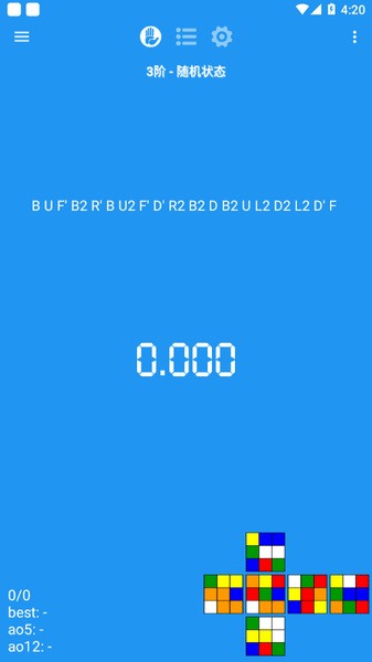 右下角是魔方的打乱状态,左下角是分组的相关信息,设置中可以调整。best指最好成绩,ao5表示最近五次去尾平均,ao12表示最近12次去尾平均,斜杠“/”前面的数字代表有效成绩,后面的数字代表还原次数