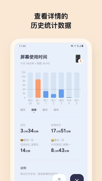 • 按 一周 / 一个月 / 一年为维度,查看你详细的屏幕使用时间和各类手机活动的历史数据