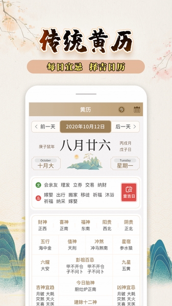 2、传统黄历:中华老黄历、农历、每日宜忌、值日星神、时辰凶吉,吉日查询。