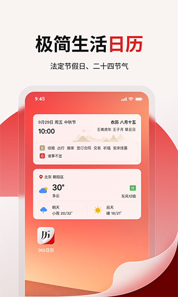 360日历app由中国360公司开发的全能型日历应用,集日程管理、时间规划、节假日提醒、天气预报、黄历查询等多种实用功能于一体。用户可以通过360日历方便地创建、编辑和同步个人日程,支持公历、农历对照及节假日、节气提示。该应用提供桌面插件功能,可将天气、黄历等信息直接呈现在手机桌面,方便快捷查看。360日历还具备车辆限行、生理期提醒等贴心服务。
