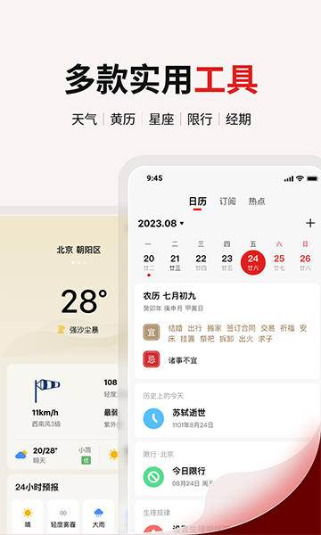 2)【多样工具】全方位生活信息,天气预报、车辆限行、星座运势、黄历农历