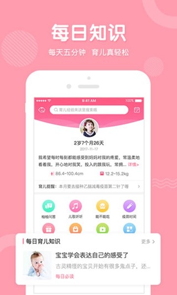 5、育儿知识锦囊,根据孕期、宝宝状态精准匹配知识,陆续推出食谱、故事、儿歌等小工具;
